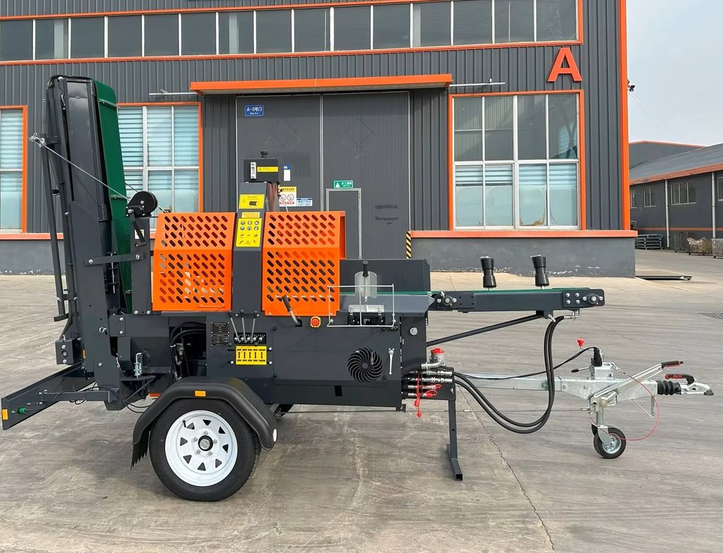 La cinta transportadora se eleva y baja con un cabrestante, tiene un giratorio y se puede bloquear en tres posiciones.La longitud de la madera se puede ajustar según se deseeLa máquina de madera tiene arranque eléctrico y su propio depósito de aceite de cadena de sierra de 5 litros.
